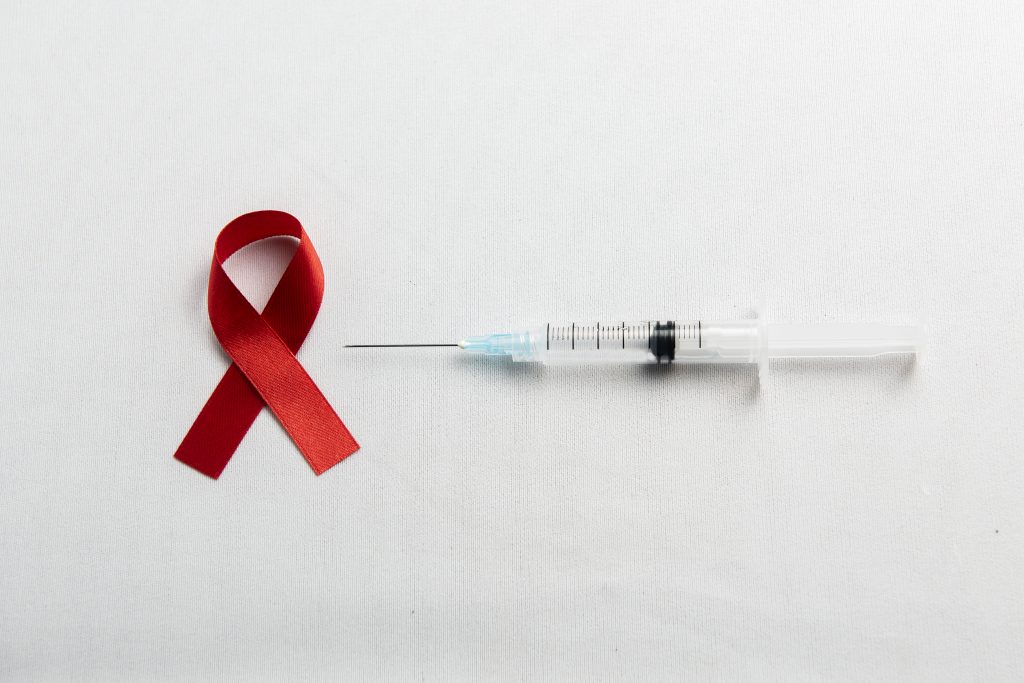 Red ribbon and syringe with white background. Hiv Aids ribbon awareness
